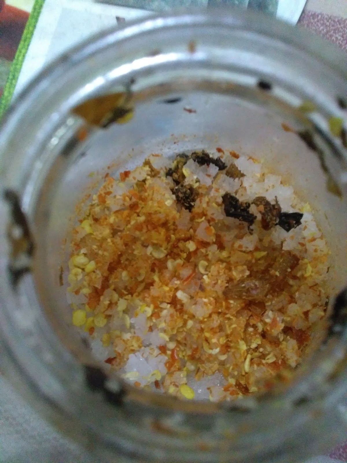 把粗海鹽、辣椒粉、可以選加點陽台的紫蘇葉(也要曬乾或陰乾),全部合體搖一搖,完工!